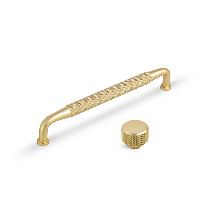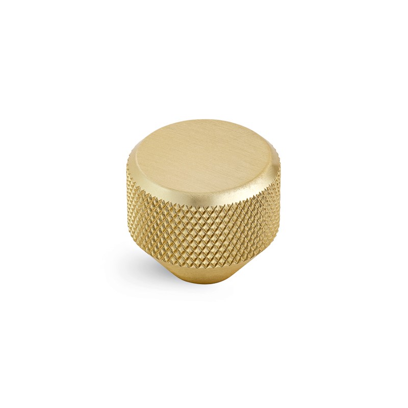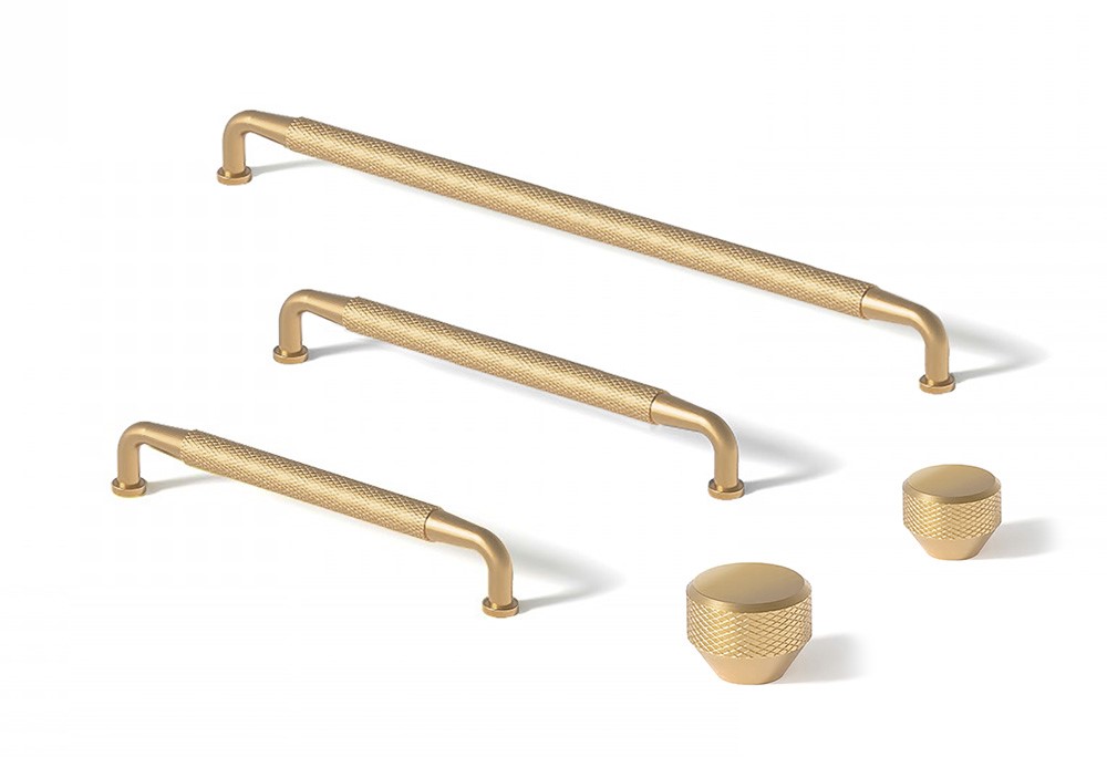 Radełkowana duża gałka o średnicy Ø 26 mm w kolorze mosiądzu szczotkowanego.