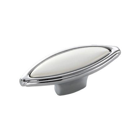 Gałka meblowa z białą wstawką ceramiczną wklejoną na obudowie koloru chrom połysk o wymiarach 69 x 26 mm.