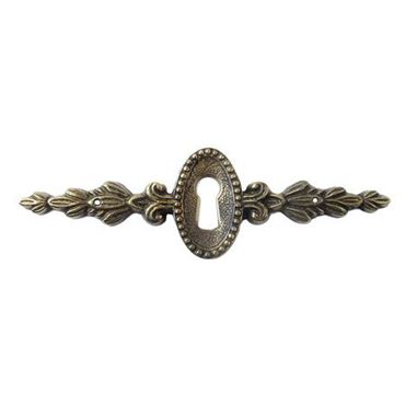 Ozdobny szyld w stylu Ludwik XVI w kolorze mosiądzu patynowanego o wymiarach 115 x 34 mm.